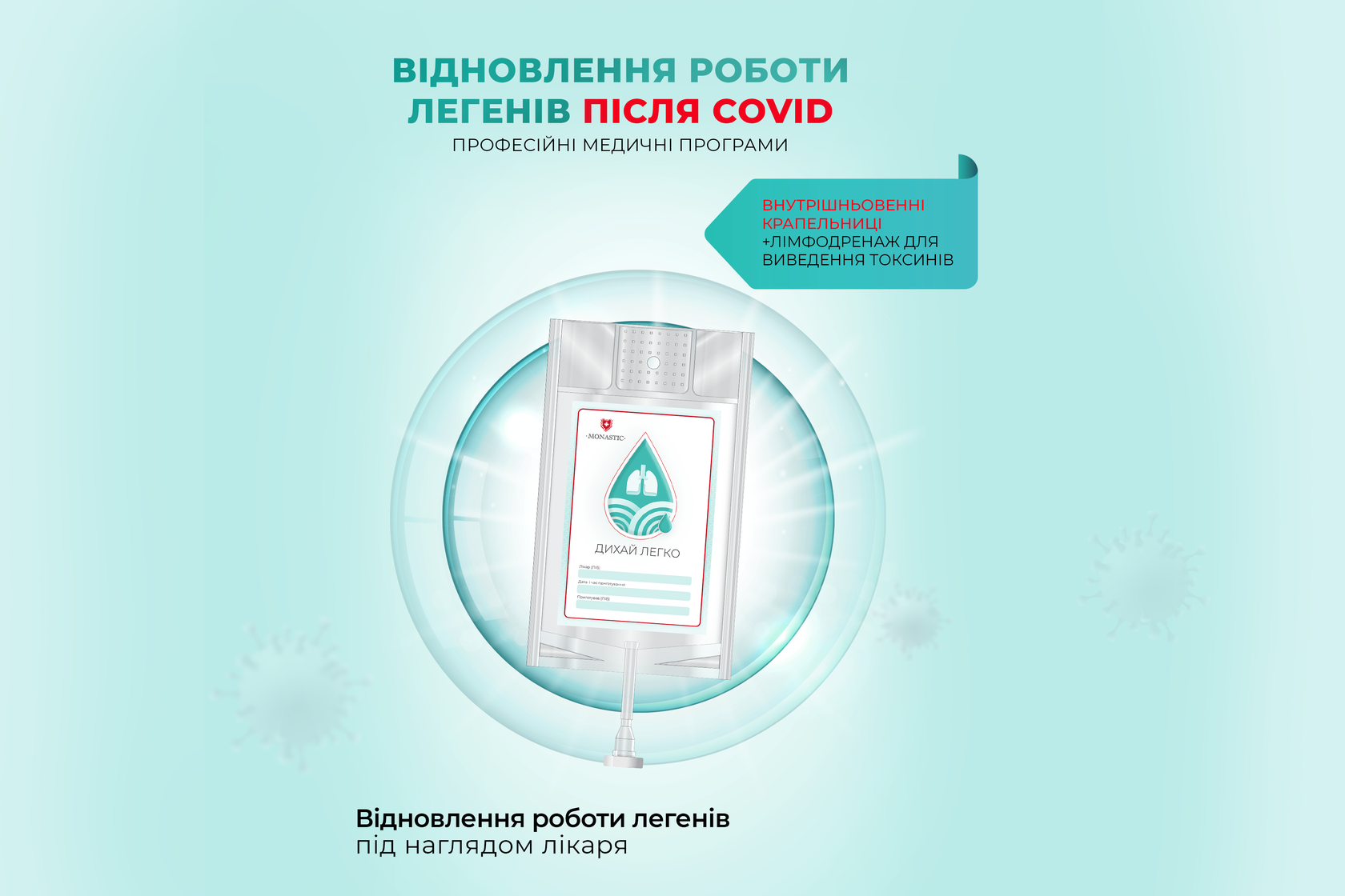 Програма для відновлення організму після перенесених захворювань дихальної системи, таких як пневмонія, включаючи ковідную пневмонію, бронхіт, трахеїт, ХОЗЛ, бронхіальна астма.У програму включені препарати необхідні для відновлення оксигенації, поліпшення всіх метаболічних процесів в організмі, підвищення імунітету і резистентності організму